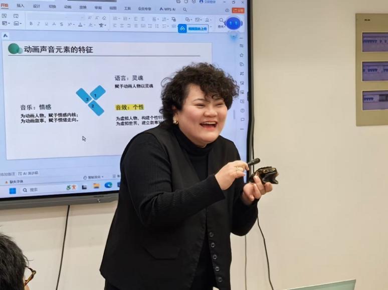动画专业的赵娴老师以《动画的声音设计》课程十年发展为线索,分享了“科研反哺教学、以赛促教、AI赋能”三者融合的实施路径。她强调,真正的智慧教学并非简单引入AI工具,而是以问题为导向重塑教学逻辑,推动教师从“知识传播者”向“学习生态设计师”转型。她现场演示了在教创赛中的教学实践,即借助青蛙玩具、糖纸等日常物品模拟音效,引导学生们认识和了解声音设计对情感叙事的建构。赵娴老师指出,AI虽能高效生成素材,但声音创作的核心仍在于人,精准解析叙事需求、清晰传达声音意图、敏锐评判生成内容,这些才是当代教师们不可替代的教学价值。