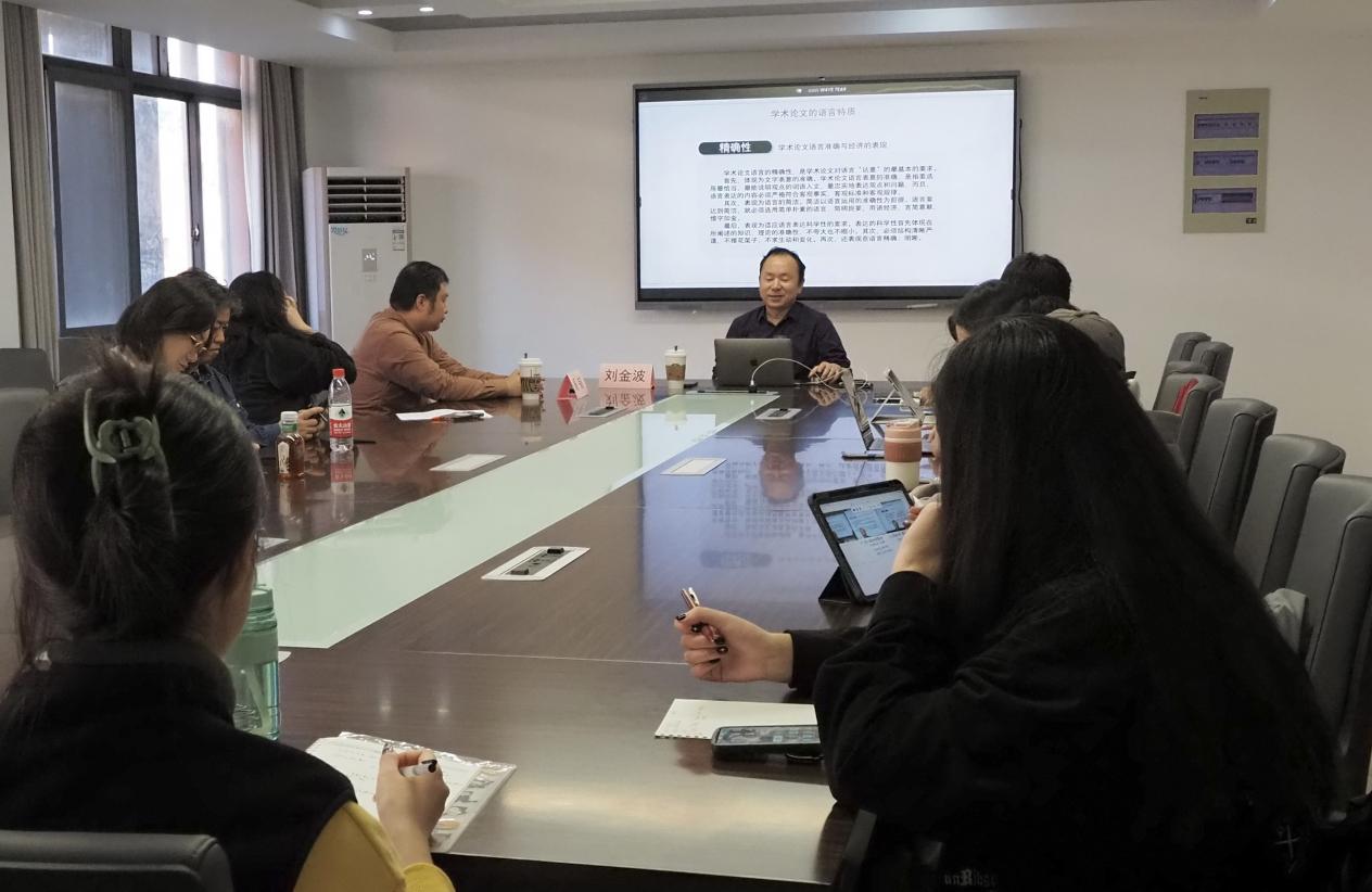 讲座伊始,刘金波教授提出了学术论文中的五个要点:选题、问题、逻辑、表达和规范,并且从什么是学术论文、学术论文的语言特质、学术语言的范式特征和误区、学术语言的表达技巧以及学术论文的格式规范五个方面展开了讲述。