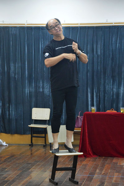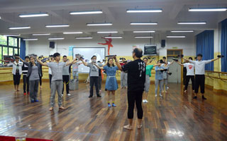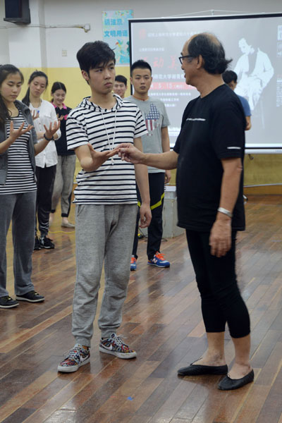 在此次工作坊中,霍达昭先生先向同学们简单介绍了默剧表演方式及特点,然后通过带领同学们观看经典默剧片段的方式为同学们生动的介绍了默剧各个发展阶段的代表人物,并分析了其各阶段的发展特点。随后,霍达昭大师与同学们进行了肢体互动游戏,通过站立、无实物模拟抛苹果等默剧的基础性练习动作,让同学们对默剧的肢体表达及力量运用有了更加深刻的体会。平时看上去简单轻松的默剧,其背后的训练其实异常艰苦,对默剧演员的肢体表达能力具有极高的要求。霍达昭先生如今已有66岁高龄,但是对默剧艺术充满热情,他的课程严格而又不缺乏趣味,深深地吸引着每一位同学,让同学们汗津津的脸上挂满笑容,几十分钟的课程结束后同学们还积极要求霍大师加课,整个形体房内充满欢声笑语。