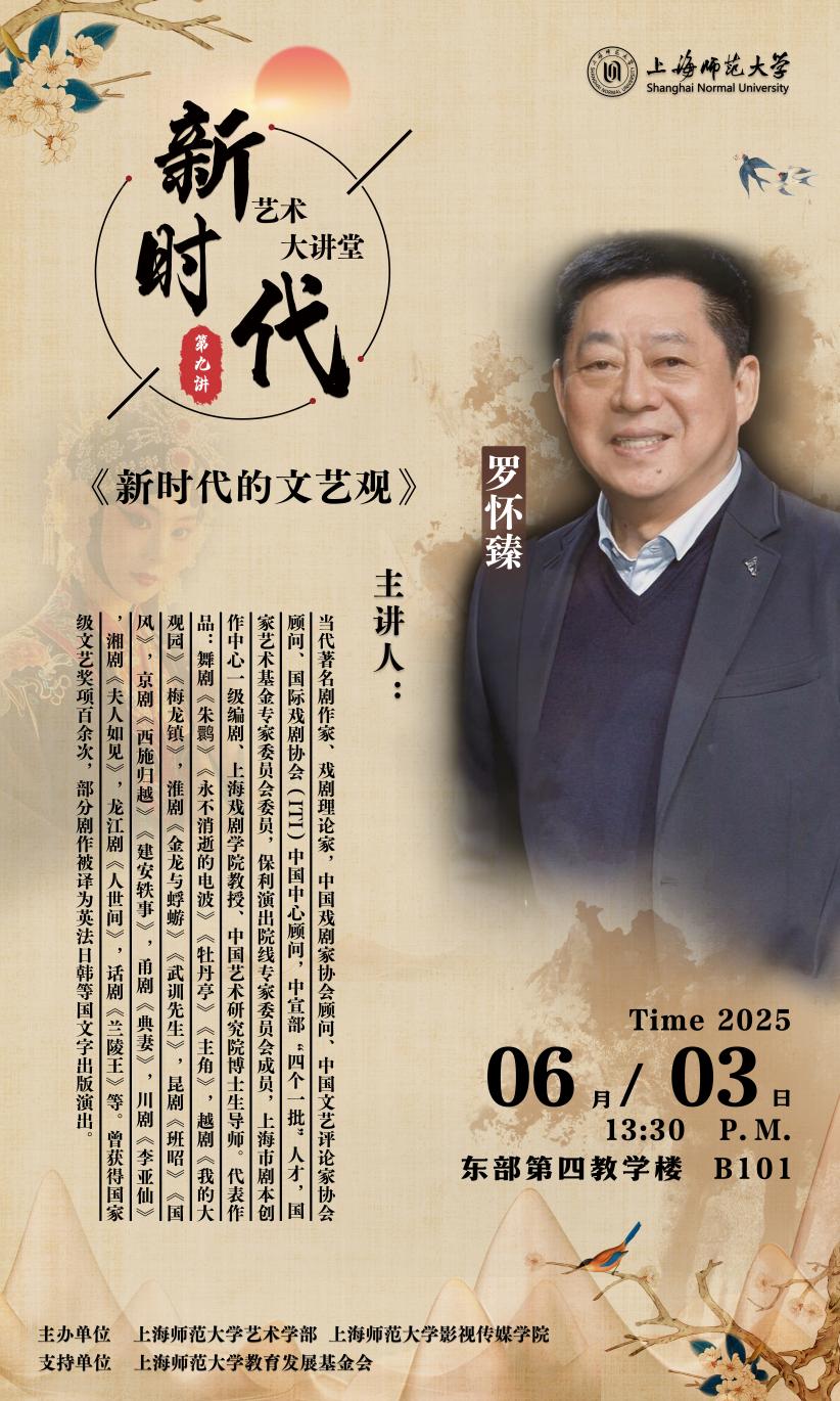 著名剧作家、戏剧理论家、戏剧教育家罗怀臻先生应邀于2025 年 6 月 3 日下午登上我校“新时代艺术大讲堂”, 作题目为“新时代的文艺观”的演讲。