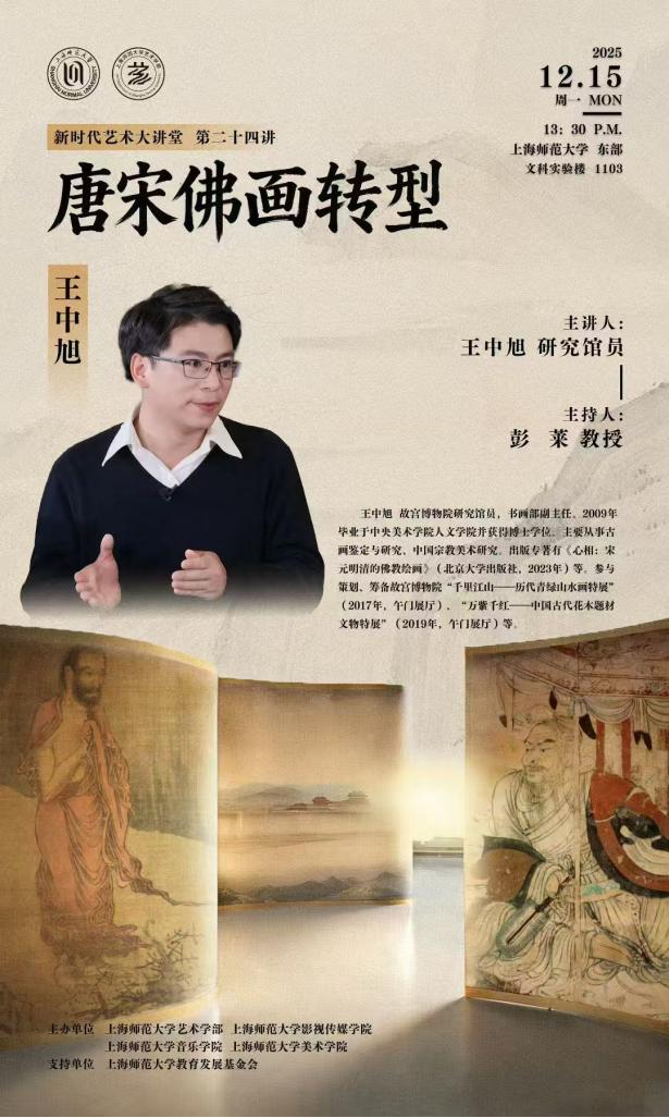 12月15日下午,故宫博物院书画部研究馆员王中旭,应上海师范大学艺术学部邀请,以“唐宋佛画转型”为题,在我校文科实验楼1103室为美术史论与中国画专业的同学们带来一场兼具学术深度与艺术视野的专题讲座。本次讲座由上海师范大学美术学院彭莱教授主持,上海美术学院傅慧敏教授、复旦大学文博学院祁姿妤副教授出席,美术学院陈研副院长与相关专业老师也参加了会议。约有60位校内外的学生、听众与会聆听