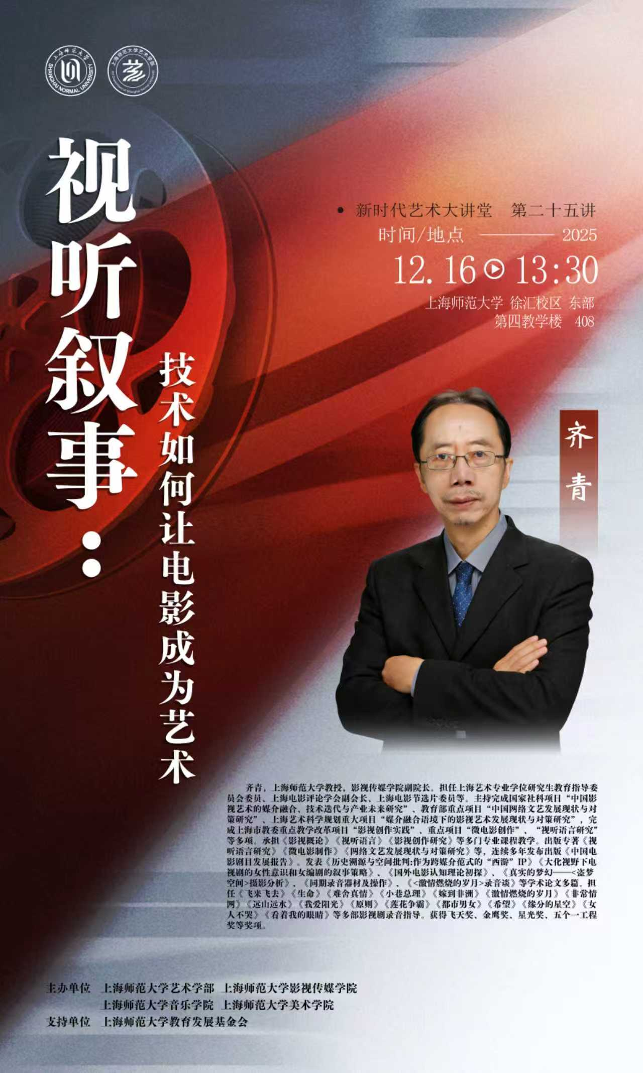 2025年12月16日下午,由上海师范大学艺术学部主办的“新时代艺术大讲堂”第二十五讲在徐汇校区第四教学楼408举行。上海师范大学影视传媒学院副院长、教授、博士生导师齐青,应邀以“视听叙事:技术如何让电影成为艺术”为题,为在场师生送上了一次跨越技术史与艺术美学的前沿性学术盛宴。